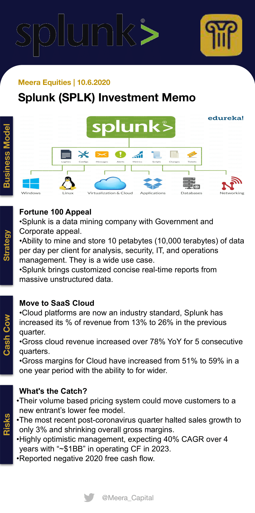 Splunk Inc. (Splunk) is engaged in the development and marketing of software solutions. The Company's offerings enable users to collect, index, search, explore, monitor, and analyze data. It’s flagship solution, Splunk Enterprise, is employed across a multitude of use cases including application management, IT operations, and security. The company has historically deployed its solutions on-premises, but the software-as-a-service delivery model is growing in popularity with Splunk Cloud.
